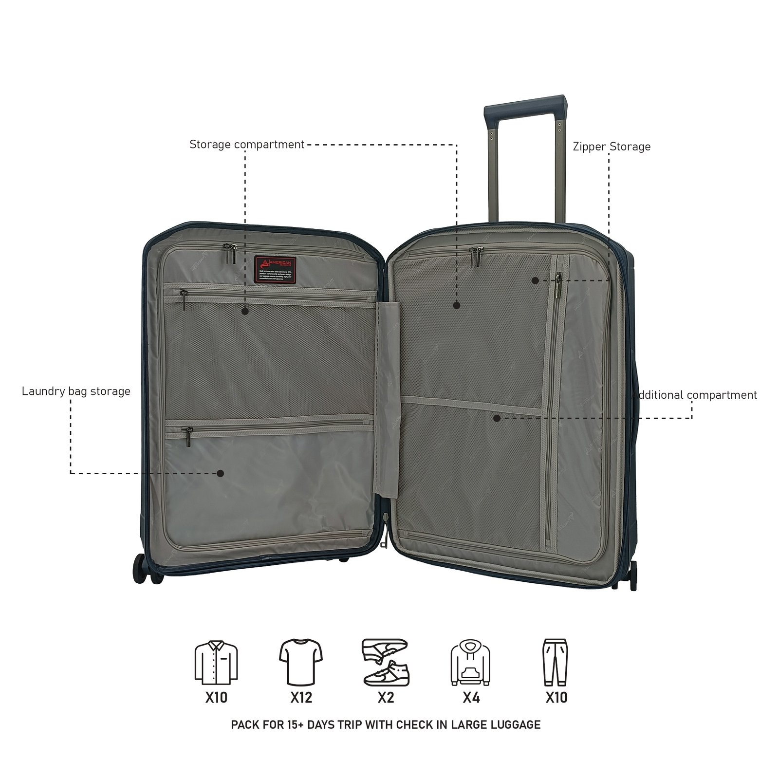 • Roomy sections with customizable packing straps
